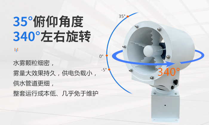 型號 | 靜風射程 (m) | 風機功率(Kw) | 水泵功率 (Kw) | 總功率(Kw) | 俯仰角度 (常規(guī)) | 旋轉(zhuǎn)角度 | 噴頭數(shù)量 | 20米處噪音 (dB) | 箱體重量 (kg) | ||