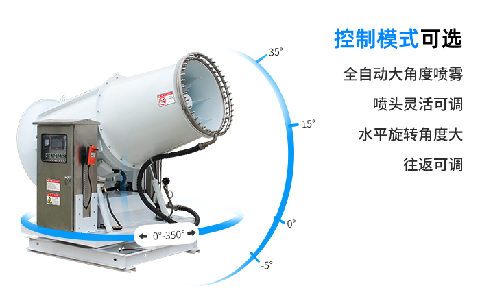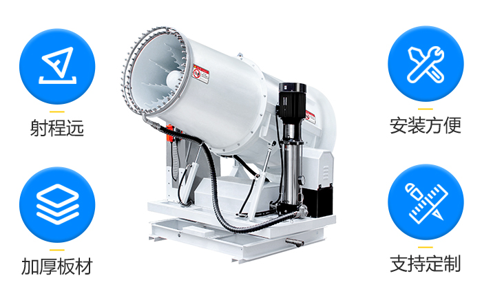 型號 | 靜風射程 (m) | 風機功率(Kw) | 水泵功率 (Kw) | 總功率(Kw) | 俯仰角度 (常規(guī)) | 旋轉(zhuǎn)角度 | 噴頭數(shù)量 | 20米處噪音 (dB) | 箱體重量 (kg) | ||