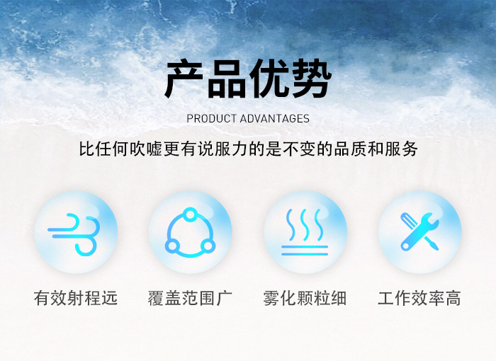 除塵范圍:粉塵治理、露天物料堆場(chǎng)、煤炭物流園區(qū)、露天礦山開(kāi)采、露天爆破粉塵、封閉卸料區(qū)、卡車卸料口、自卸車卸料粉塵、大型裝載車工作粉塵、沿海港口裝運(yùn)、轉(zhuǎn)運(yùn)煤炭、礦石、散裝粉料搬運(yùn)等粉塵污染治理;保濕降溫:飛機(jī)場(chǎng)、高速公路、車站、碼頭、公共場(chǎng)所、運(yùn)動(dòng)場(chǎng)地、炎熱場(chǎng)地等大范圍降塵保濕降溫消毒;噴藥病害防治:垃圾填埋場(chǎng)、衛(wèi)生防疫、城市園林綠化以及自然災(zāi)害過(guò)后大面積的殺菌、消毒、除臭、防疫防治病蟲(chóng)害等。
