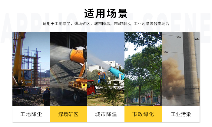 揚(yáng)塵污染治理:適用于對(duì)煤礦行業(yè)、化工行業(yè)、發(fā)電行業(yè)、建筑拆遷、工地施工等容易產(chǎn)生揚(yáng)塵污染的場(chǎng)所進(jìn)行抑塵、降塵治理;