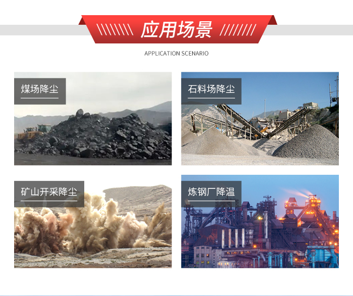 適用范圍:適用于對(duì)煤礦行業(yè)、化工行業(yè)、發(fā)電行業(yè)、建筑拆遷、工地施工等容易產(chǎn)生揚(yáng)塵污染的場所進(jìn)行抑塵、降塵治理