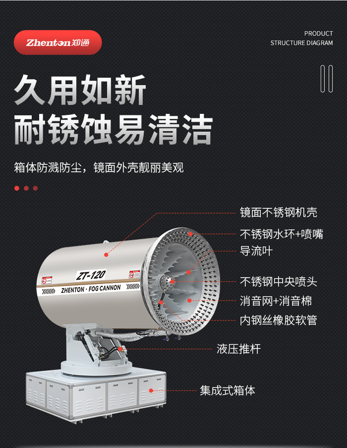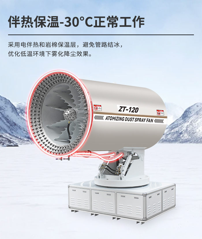 鄭州鄭通風(fēng)機(jī)廠家生產(chǎn)的這款120米不銹鋼環(huán)保除塵霧炮機(jī),通體采用不銹鋼材質(zhì)制造,耐腐蝕易清潔,外形美觀,120米射程,霧化細(xì),效率高。采用電伴熱和巖棉保溫層,低溫環(huán)境也能穩(wěn)定運(yùn)行。