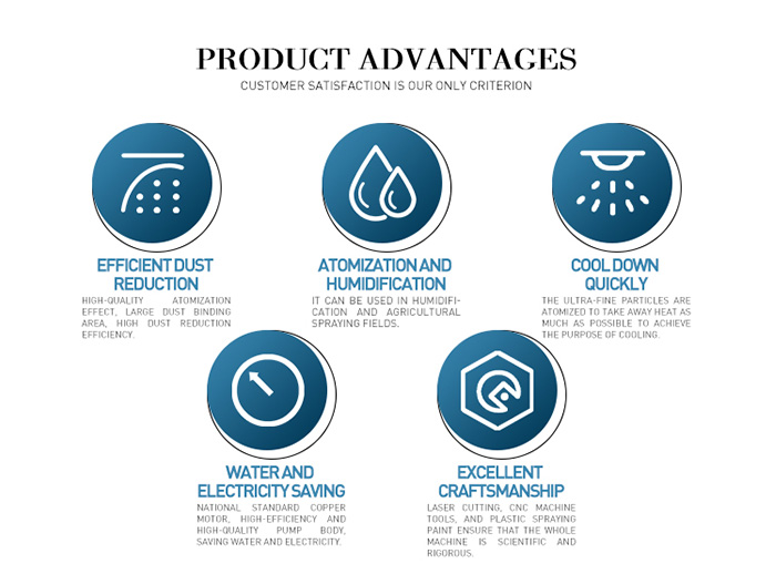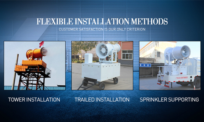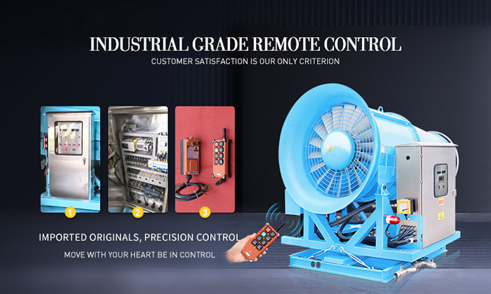 型號 | 靜風(fēng)射程 (m) | 風(fēng)機(jī)功率(Kw) | 水泵功率 (Kw) | 總功率(Kw) | 俯仰角度 (常規(guī)) | 旋轉(zhuǎn)角度 | 噴頭數(shù)量 | 20米處噪音 (dB) | 箱體重量 (kg) | ||